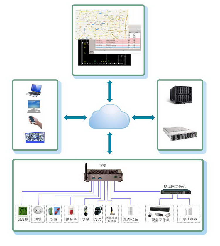 子系統(tǒng)主要包括:環(huán)境監(jiān)測系統(tǒng)、無線設備測溫系統(tǒng)、煙火監(jiān)測系統(tǒng)、門磁監(jiān)測系統(tǒng)、入侵監(jiān)測系統(tǒng)、水浸監(jiān)測系統(tǒng)、視頻監(jiān)控系統(tǒng)。
